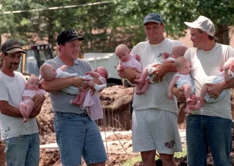 在這張照片中,我們看到四個男人抱著嬰兒。他們是建築工人!他們負責建造麥考海家的房子,並有幸擁抱和照顧七胞胎。這個畫面真的很感人。這是波比和肯尼的最愛之一,因為嬰兒看起來很安詳,工人們看起來很高興能把他們抱在懷裡。父母不想讓他們的孩子過多地暴露在外面,但他們並沒有拒絕一點幫助!他們的孩子們都很高興。