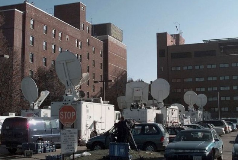 新聞團隊在得梅因醫院前設立了一個營地