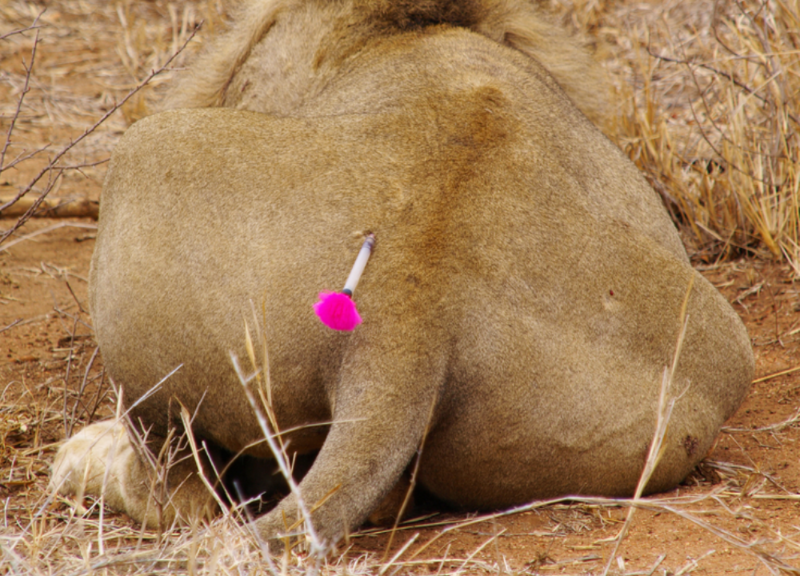 獣医は、ライオンが頭を反対方向に向けるまでタイミングを見計らった。その後、ゆっくりとライオンに近づき、鎮静剤をライオンの下半身にすばやく注入した。あとは、完全に鎮静剤が効くまで待つのみ。